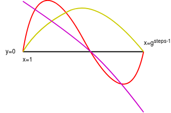 Purple: computational trace polynomial (P). Green: interpolant (I) (notice how the interpolant is constructed to equal the input (which should be the first step of the computational trace) at x=1 and the output (which should be the last step of the computational trace) at \(x=g^{steps-1}\). Red: \(P - I\). Yellow: the minimal polynomial that equals \(0\) at \(x=1\) and \(x=g^{steps-1}\) (that is, \(Z_2\)). Pink: \(\frac{P - I}{Z_2}\).