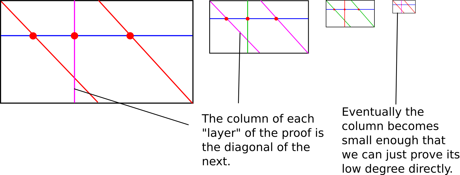 Now, we need to prove that \(P\), \(D\) and \(B\) are all actually polynomials, and of the right max-degree. But FRI proofs are big and expensive, and we don't want to have three FRI proofs. So instead, we compute a pseudorandom linear combination of \(P\), \(D\) and \(B\) (using the Merkle root of \(P\), \(D\) and \(B\) as a seed), and do an FRI proof on that: