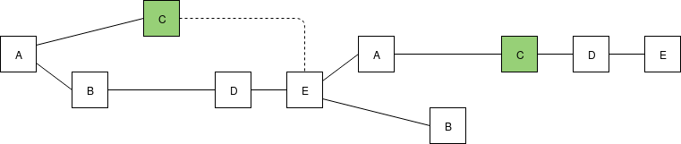Note that all four of the validators could have seen one or both of \(B\)'s blocks, and \(D\) and \(E\) could have seen \(C\)'s second block, making that the latest message in their views instead of \(C\)'s first block; however, the structure of the chain itself gives us no evidence that they actually did. Fortunately, as we will see below, this ambiguity does not matter for us.