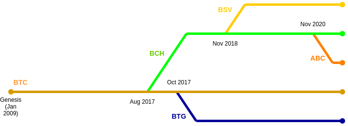 Major Bitcoin forks, as of 2020. Does not include Bitcoin Diamond, Bitcoin Rhodium, Bitcoin Private, or any of the other long list of Bitcoin forks that I would highly recommend you just ignore completely, except to sell (and perhaps you should sell some of the forks listed above too, eg. BSV is definitely a scam!)