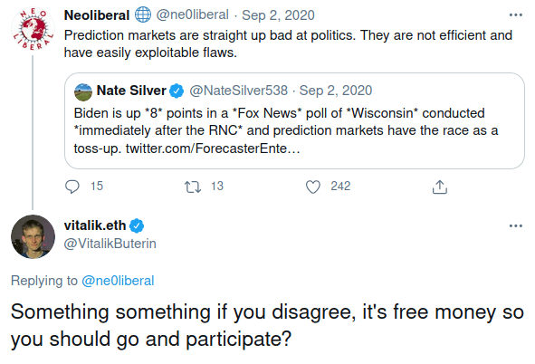 My first bet on this election was actually not on a blockchain at all. When Kanye announced his presidential bid in July, a political theorist whom I ordinarily quite respect for his high-quality and original thinking immediately claimed on Twitter that he was confident that this would split the anti-Trump vote and lead to a Trump victory. I remember thinking at the time that this particular opinion of his was over-confident, perhaps even a result of over-internalizing the heuristic that if a viewpoint seems clever and contrarian then it is likely to be correct. So of course I offered to make a $200 bet, myself betting the boring conventional pro-Biden view, and he honorably accepted.