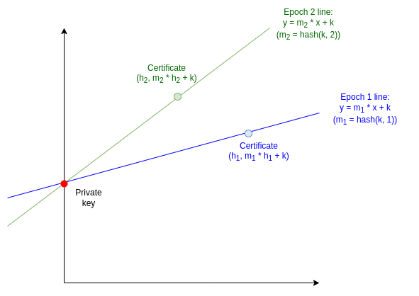 For each epoch \(e\), we take the line \(L_e(x) = hash(k, e) * x + k\). The slope of the line is \(hash(k, e)\), and the y-intercept is \(k\); neither is known to the public. To make a certificate for a message \(m\), the sender provides \(y = L_e(hash(m)) =\) \(hash(k, e) * hash(m) + k\), along with a ZK-SNARK proving that \(y\) was computed correctly.