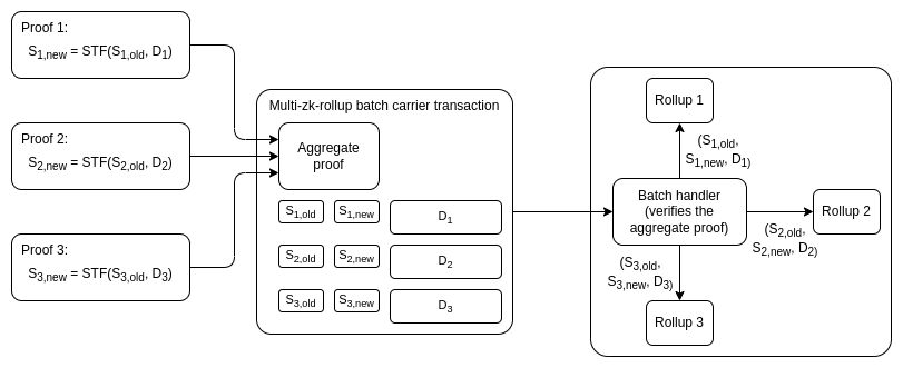 This would be an open protocol: any ZK-rollup could join, and any batch prover could aggregate proofs from any compatible ZK-rollup, and would get compensated by the aggregator with a transaction fee. The batch handler contract would verify the proof once, and then pass off a message to each rollup with the \((S_{old}, S_{new}, D)\) triple for that rollup; the fact that the triple came from the batch handler contract would be evidence that the transition is valid.