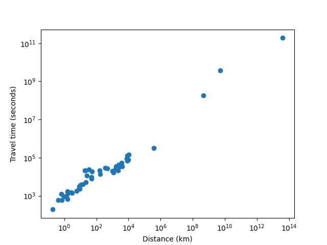 travel_time = 733.002223593754 * distance^0.591980777827876WAAAAAT?!?!! From this chart it seems like there is a surprisingly precise relationship governing travel time from point A to point B that somehow holds across such radically different transit media as walking, subways and buses, airplanes and (!!) interplanetary and hypothetical interstellar spacecraft. I swear that I am not cherrypicking; I did not throw out any data that was inconvenient, everything (including the space stuff) that I checked I put on the chart.