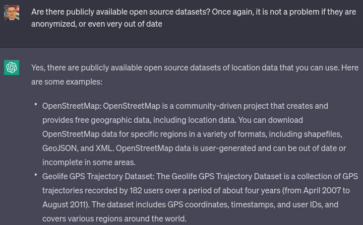 I went with the GeoLife dataset. I did notice that while it claims to be about users around the world, primarily it seems to focus on people in Seattle and Beijing, though they do occasionally visit other cities. That said, I'm not a perfectionist and I was fine with it. I asked ChatGPT to write me a script to interpret the dataset and extract a randomly selected coordinate from each file: