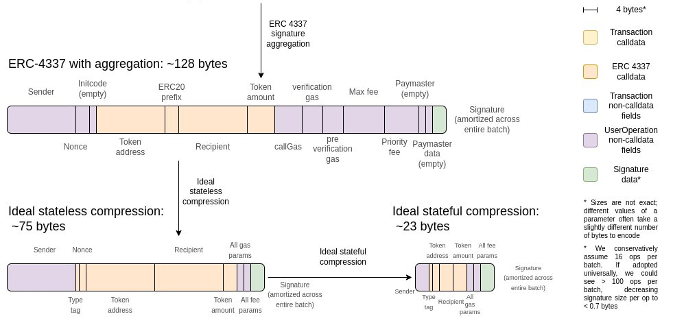 DELEGATECALLto allow each individual wallet to call into it, but that code still needs to be accessed in each block that uses it. Under the Verkle tree gas costs EIP, 12,800 bytes would make up 413 chunks, and accessing those chunks would require paying 2xWITNESS_BRANCH_COST(3,800 gas total) and 413xWITNESS_CHUNK_COST(82,600 gas total). And this does not even begin to mention the ERC-4337 entry-point itself, with 23,689 bytes onchain in version 0.6.0 (under the Verkle tree EIP rules, ~158,700 gas to load).This leads to a problem: the gas costs of actually accessing this code would have to be split among transactions somehow. The current approach that ERC-4337 uses is not great: the first transaction in a bundle eats up one-time storage/code reading costs, making it much more expensive than the rest of the transactions. Enshrinement in-protocol would allow these commonly-shared libraries to simply be part of the protocol, accessible to all with no fees.
