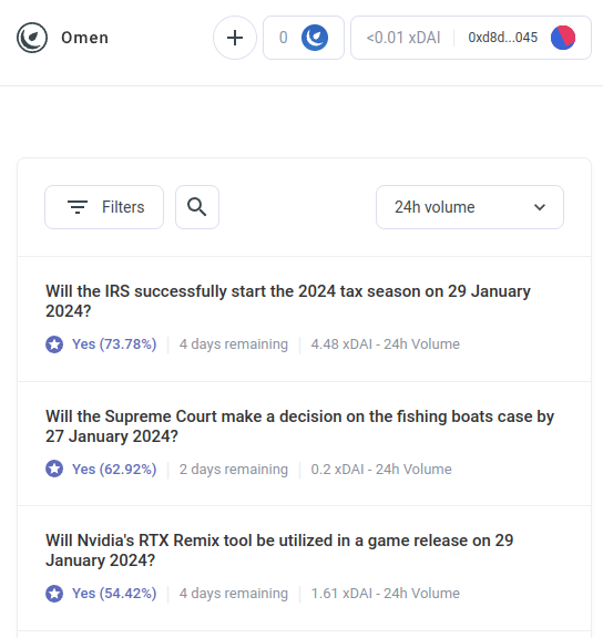 But AI arbitrage bots are only the first example of a much bigger category, which I expect will soon start to include many other applications. Meet AIOmen, a demo of a prediction market where AIs are players: