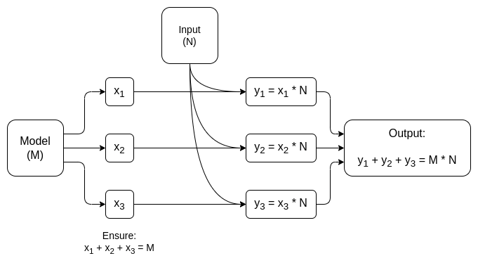 A simplified diagram of one of these approaches, keeping the model private but making the inputs public. If we want to keep the model and the inputs private, we can, though it gets a bit more complicated: see pages 8-9 of the paper.