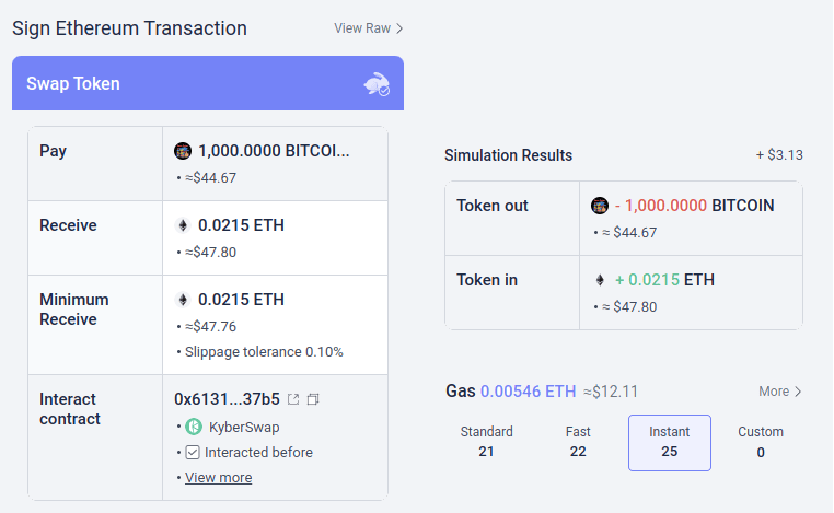 Rabby explaining to me the consequences of signing a transaction to trade all of my "BITCOIN" (the ticker of an ERC20 memecoin whose full name is apparently "HarryPotterObamaSonic10Inu") for ETH.