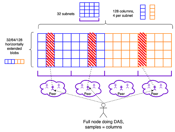 The next stage is likely to be a simplified version of DAS called PeerDAS. In PeerDAS, each node stores a significant fraction (eg. 1/8) of all blob data, and nodes maintain connections to many peers in the p2p network. When a node needs to sample for a particular piece of data, it asks one of the peers that it knows is responsible for storing that piece.
