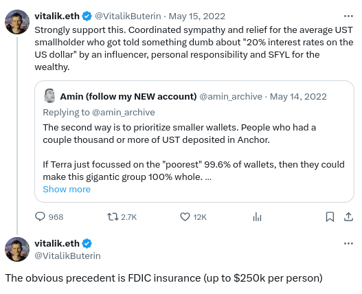 When projects collapse or get hacked, and only partial refunds are possible, don't make the refunds proportional. Instead, make smaller users whole first, up to some threshold (eg. $50k). Two years ago, when I proposed this idea, many treated it with scorn, misrepresenting the idea as asking for government bailouts. Today, nobody seems to care about principles anymore, and so even versions of this idea that are government-backed can perhaps more easily get adopted. Here, though, I am not proposing anything to do with governments; rather, I am proposing that project teams put into their terms of service an expectation that in the event of project insolvency, partial refunds will be prioritized in this way. The only request to governments is that appropriate rules get passed so that bankruptcy courts acknowledge the legitimacy of such arrangements.