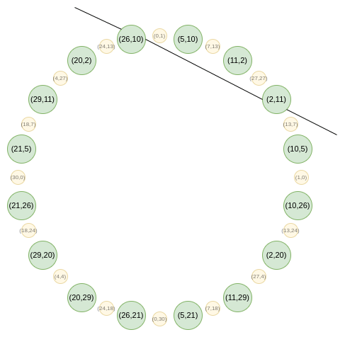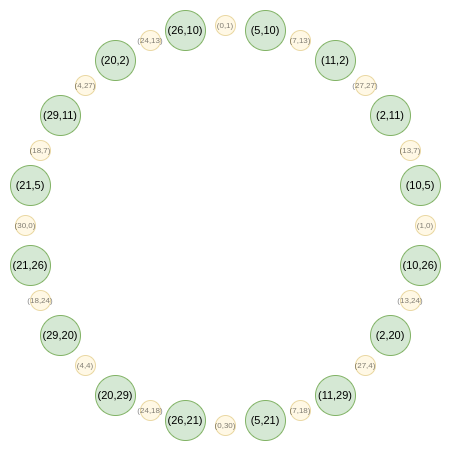 Here is where the clever trick of circle STARKs comes in. Given a prime \(p\), it turns out that we also have easy access to a group of size \(p+1\) that has similar two-to-one properties: the set of points \((x,y)\) where \(x^2 + y^2 = 1\). Let's look at this structure modulo 31: